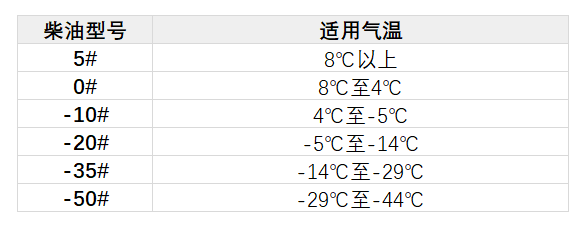 下面這張表格是目前市面上常見的柴油牌號及其使用溫度范圍,根據當地常年的溫度變化選擇柴油,還是很有必要的。