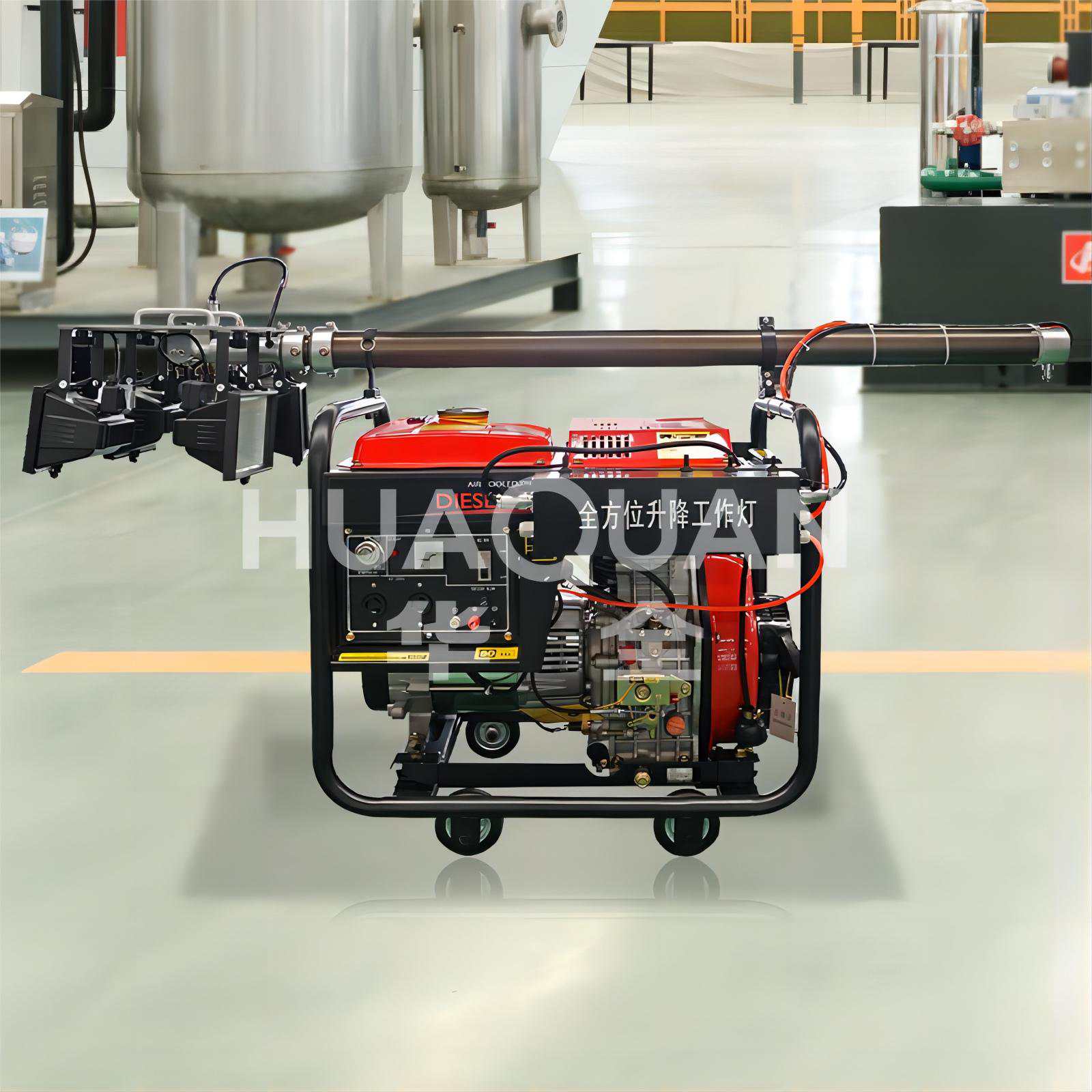 華全電力移動照明燈塔在大功率照明燈基礎上,為它搭配了10kW、5kW發電機組,用戶可以自由選擇用汽油還是用柴油發電。這批新西蘭客戶采購的機器,就是5kW的規格。